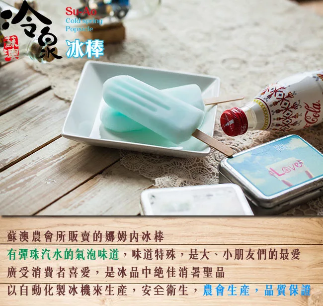 宜蘭蘇澳地區農會所販賣的冷泉冰品,味道香醇,廣受消費者喜愛,蘇澳地區農會表示,所有的冰品類完全採用蘇澳特有的冷泉來製作,將冷泉所殘留的有害礦物質過濾後,再交由製冰廠採用自動化製冰機來製冰,而所有人員進出皆需事先除塵,才能進入製作出密度高、口感佳的冰淇淋;非常特別,這麼多樣化的各式冰品,有機會前往宜蘭,可別忘了到蘇澳地區農會旁的蘇農冷泉冰品,來好好的品嘗品嘗這道地的冷泉冰棒,以及冰淇淋喔!